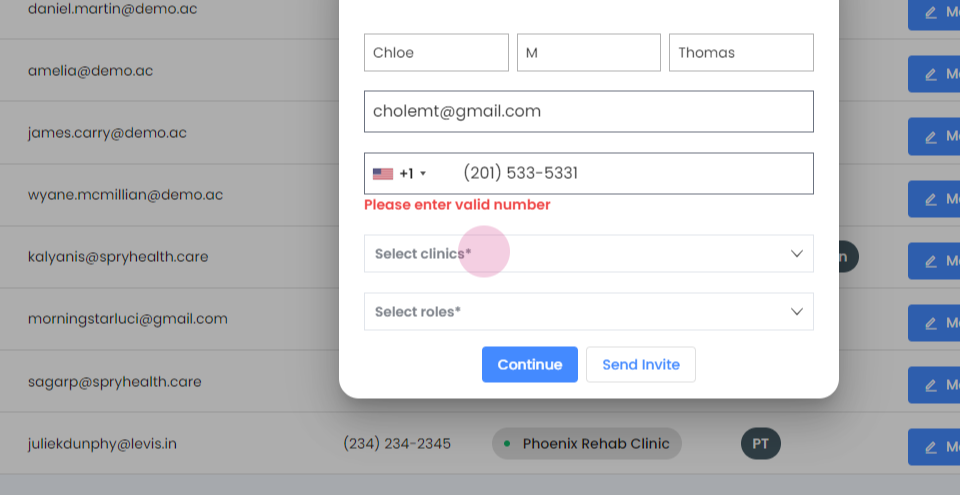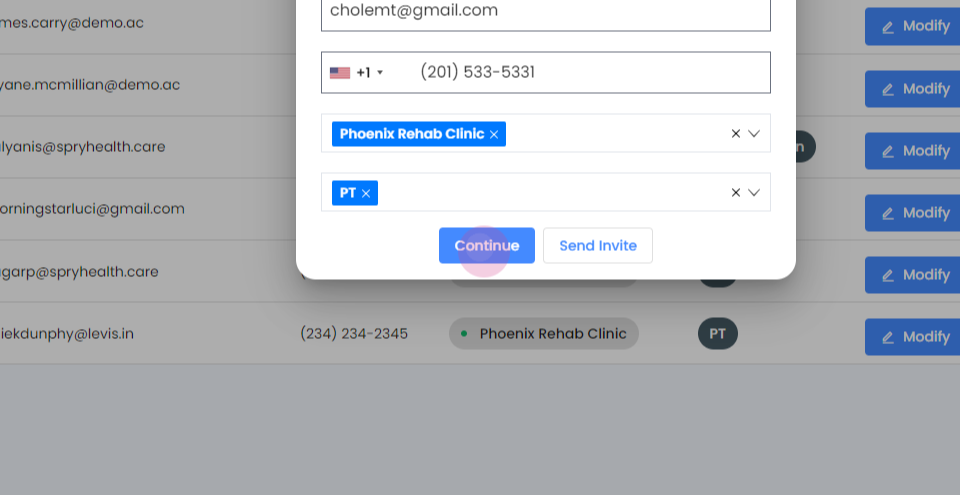 Step 6: Decide between sending an invite or creating the profile yourself. If you select send invite, the user receives an email to create their own profile. If you choose continue, you'll create the user profile.