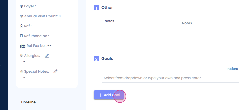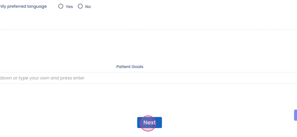 Step 1: Begin with the subjective section. Here, you'll find a simple text box, followed by a section for patient goals. Patients can either select their goals from a dropdown menu or type in their own.