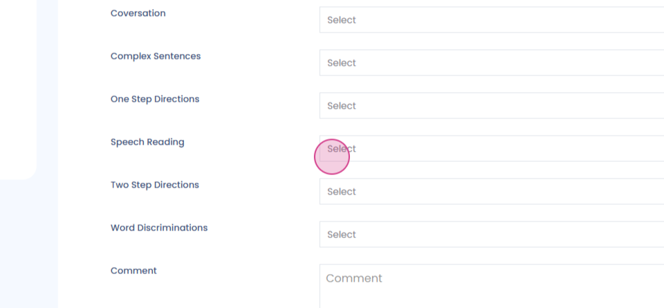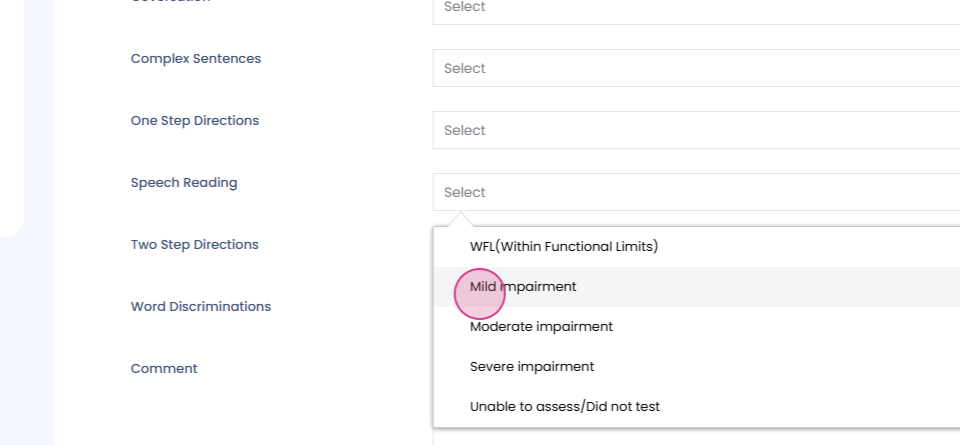 We've provided dropdown menus for each title, such as speech and reading, with options like 'within functional limits' or 'mild impairment'.