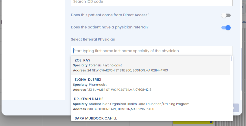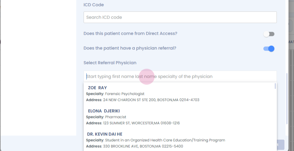 Step 12: You can select if the patient is direct access or the patient has come from a physician referral.
