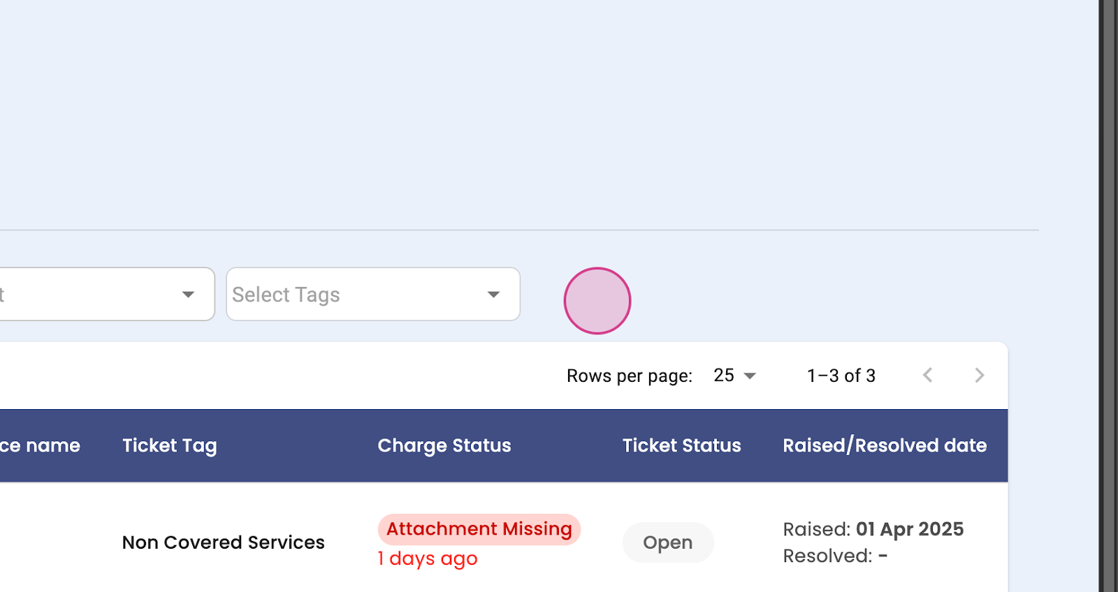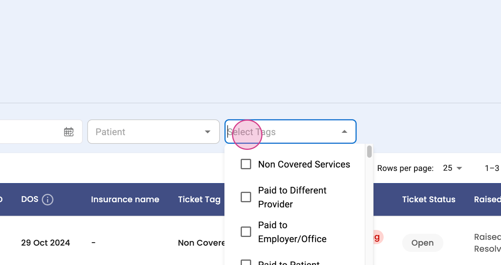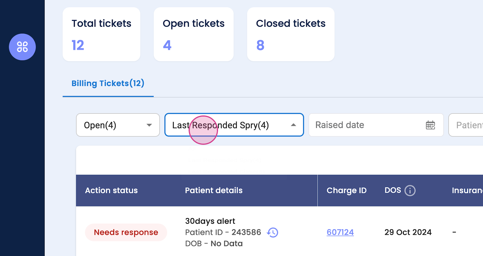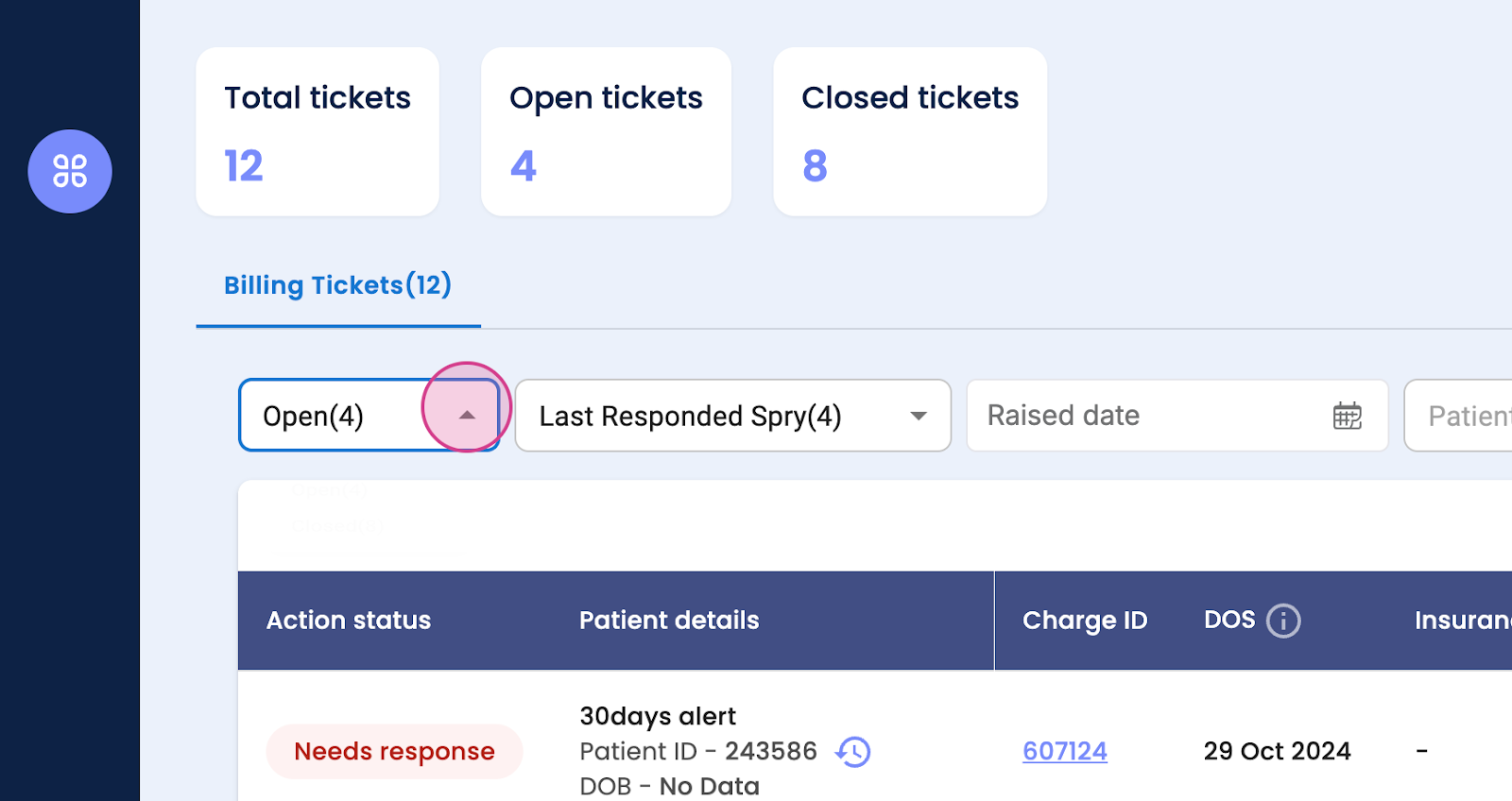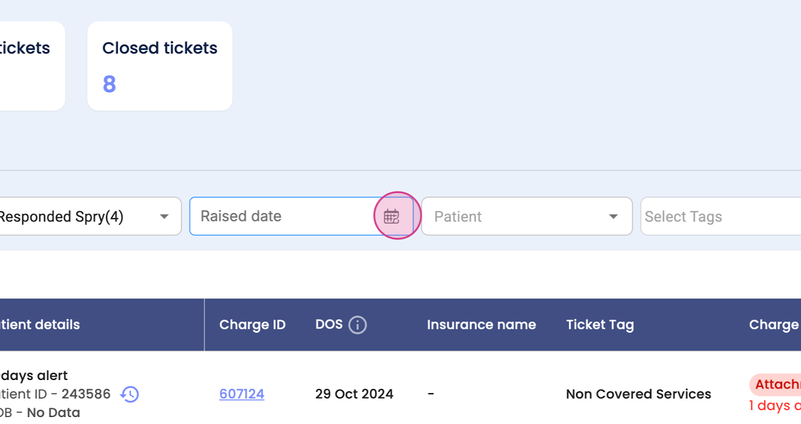 Step 8: View the action status, response, or need response. You'll also see patient details, charge ID, date of service, insurance name, ticket tax, non-covered, covered, etc., charge status, accepted, not accepted, ticket status, open or closed, raised or resolved date. You'll see 25 tickets on one page.