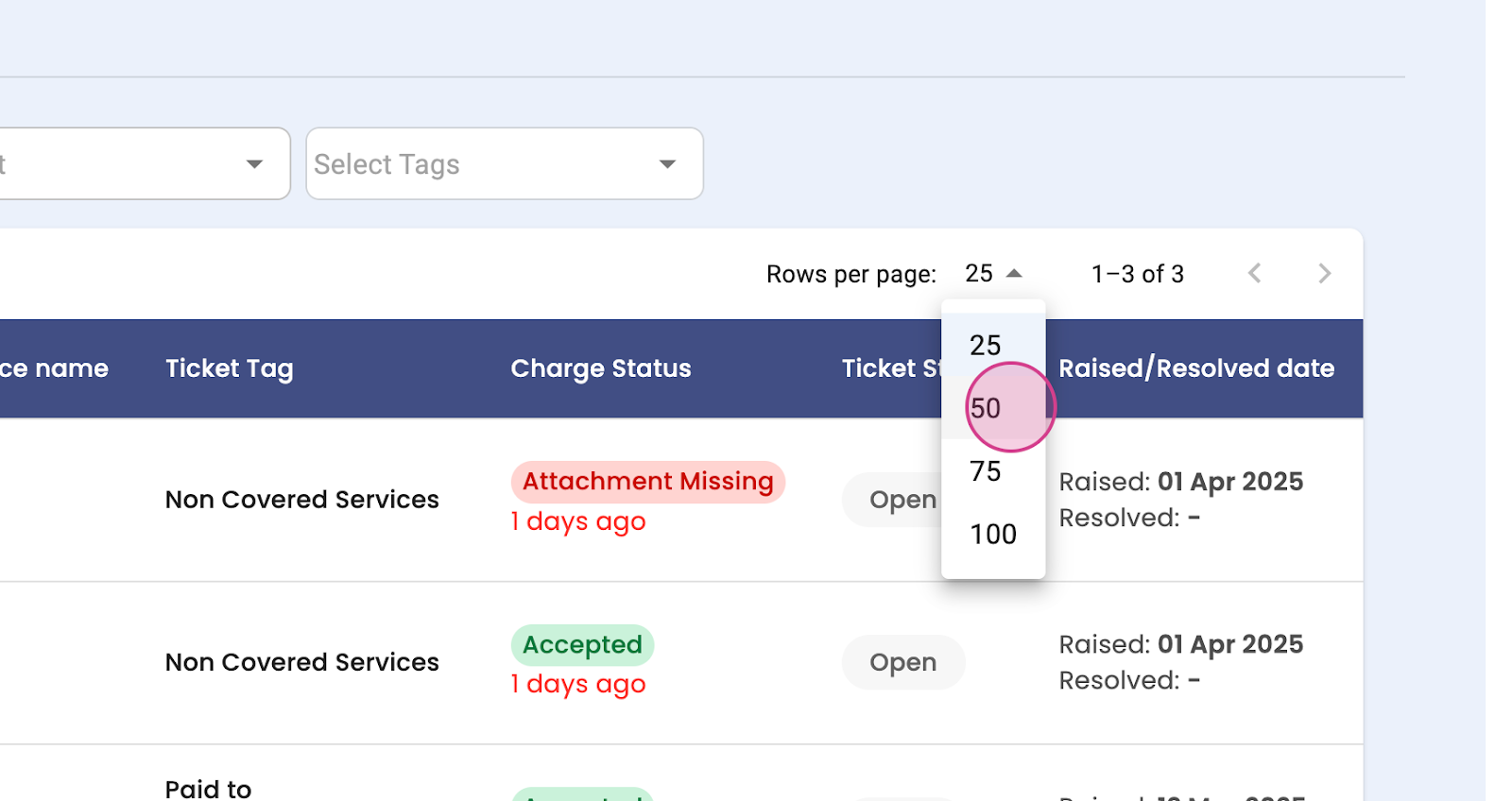 Step 9: If you need to see more tickets, select the numbers from the drop-down menu.