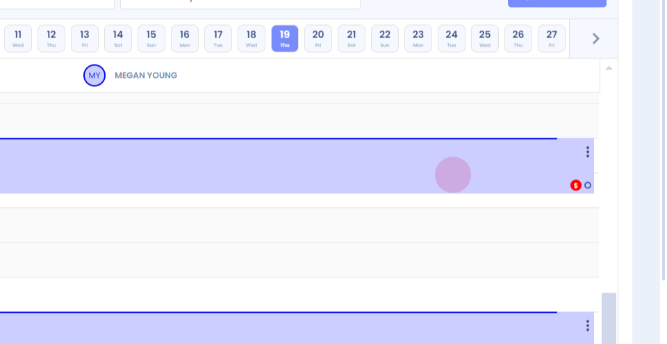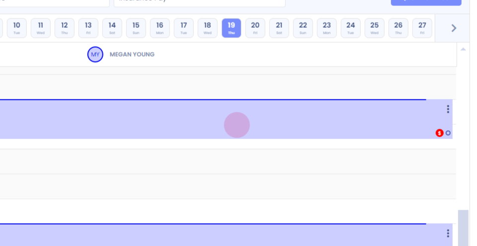 The scheduler displays two appointments for the therapist, Megan Young. The patient, Ross Helms, has a red dollar sign next to his appointment.