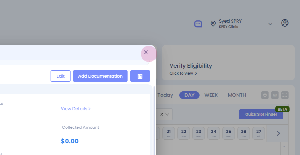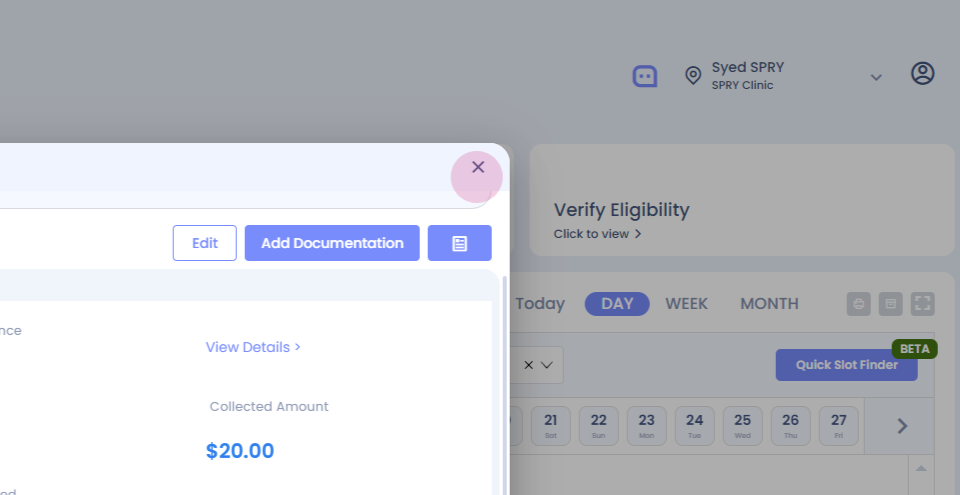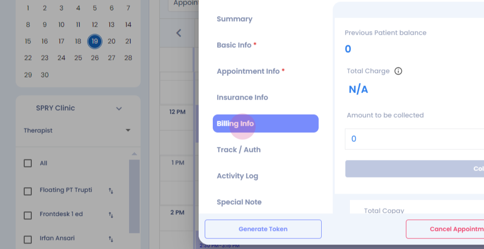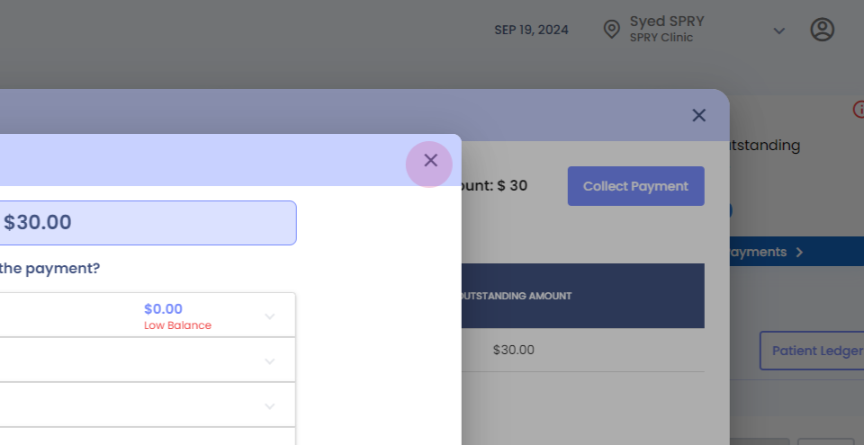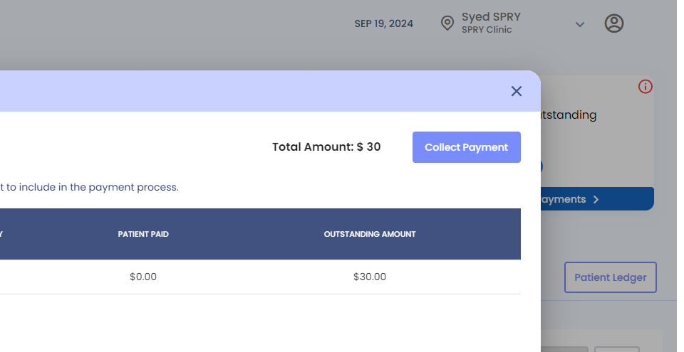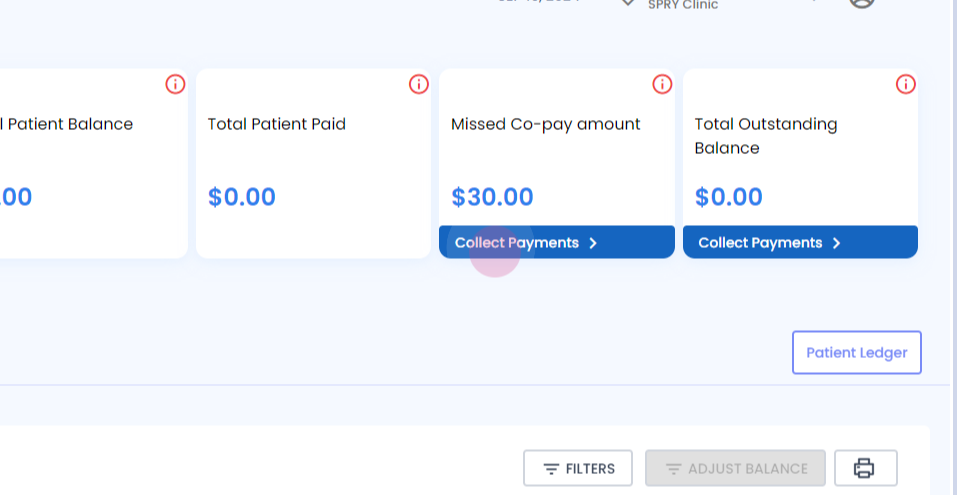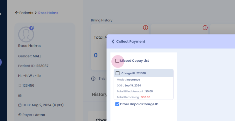 Here, we've added a "Missed Copay" feature. It shows a missed copay amount of thirty dollars that needs to be collected from the patient. To collect this payment,