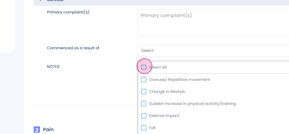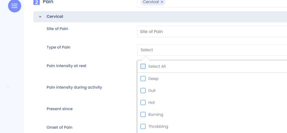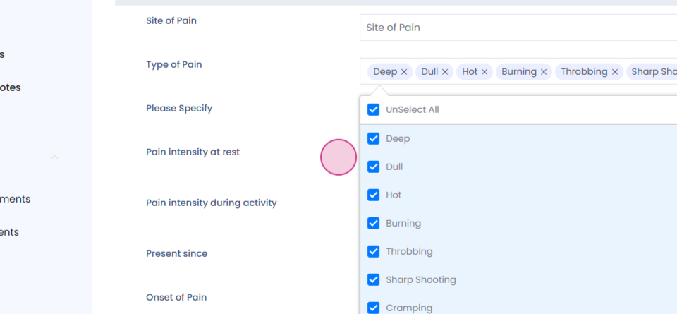Step 3: Proceed to the Pain section. Here, you'll find details such as the pain intensity scale and drop-down menus for different types of pain.