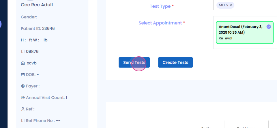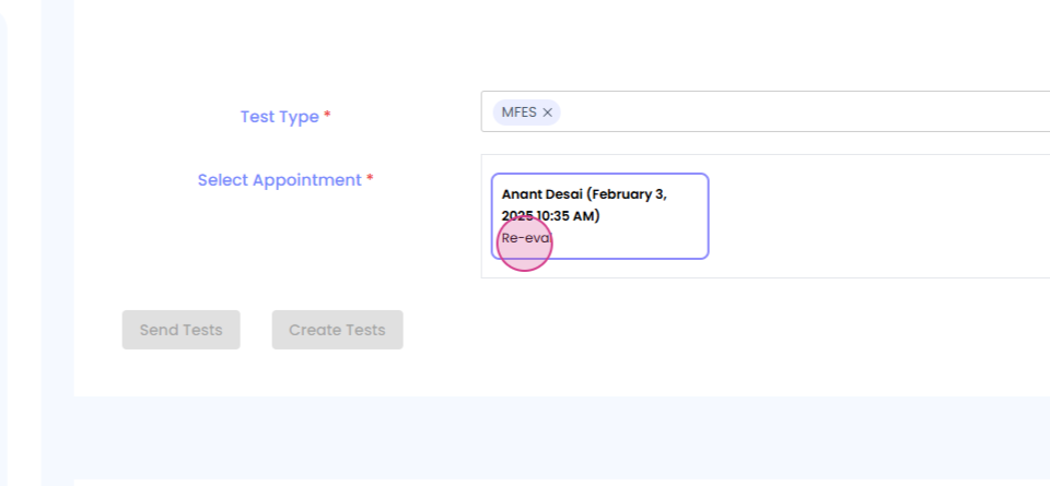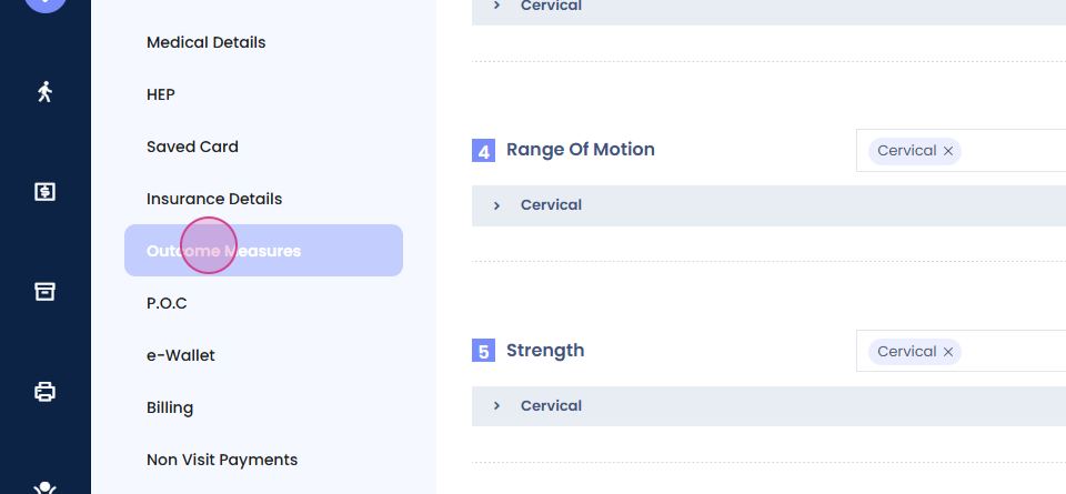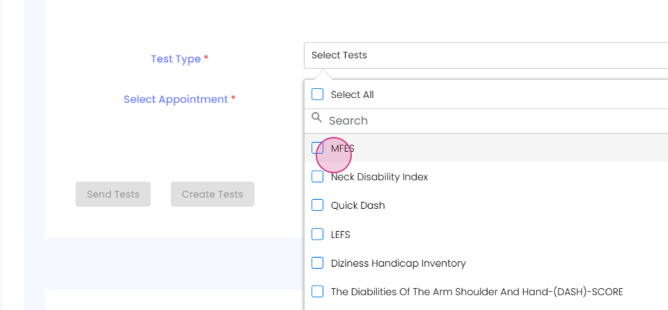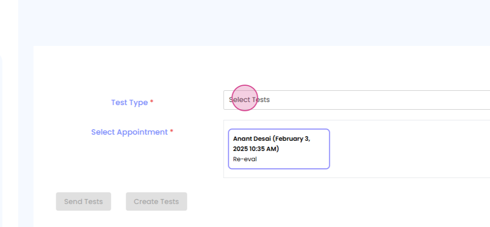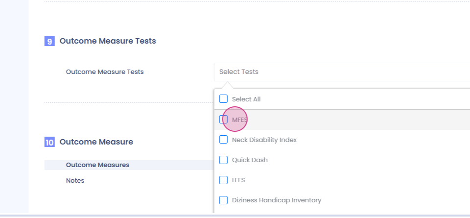 Step 9: Under the timeline, you'll find the Outcome Measure section. Here, you can select an outcome measure, choose the appointment, and send the test to the patient.