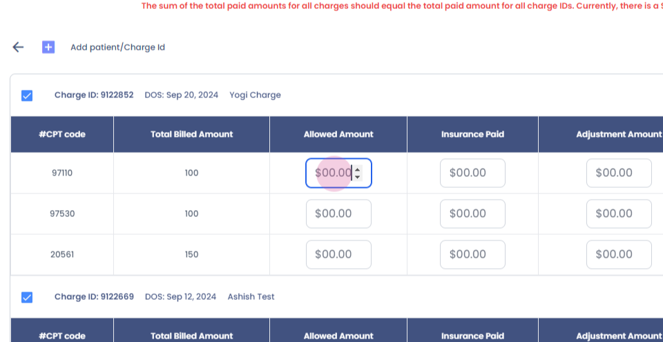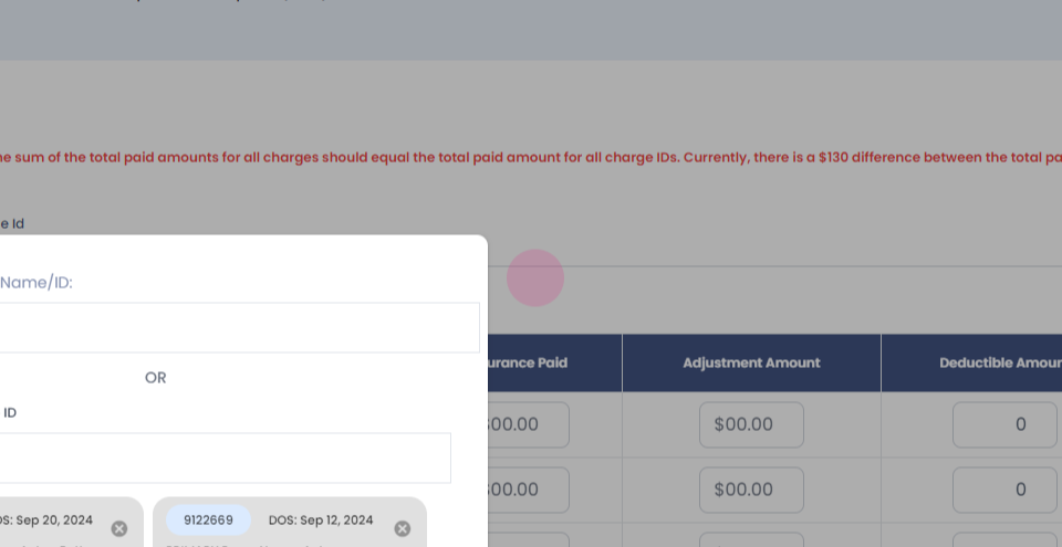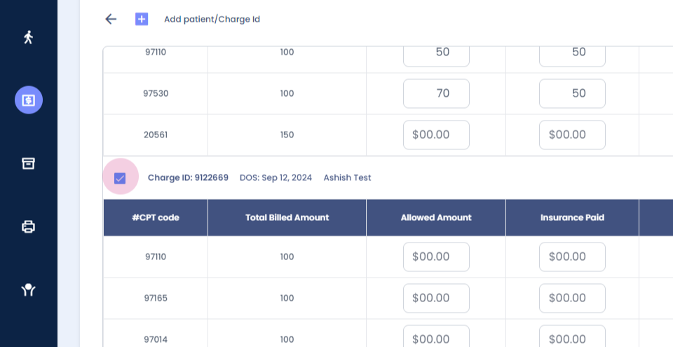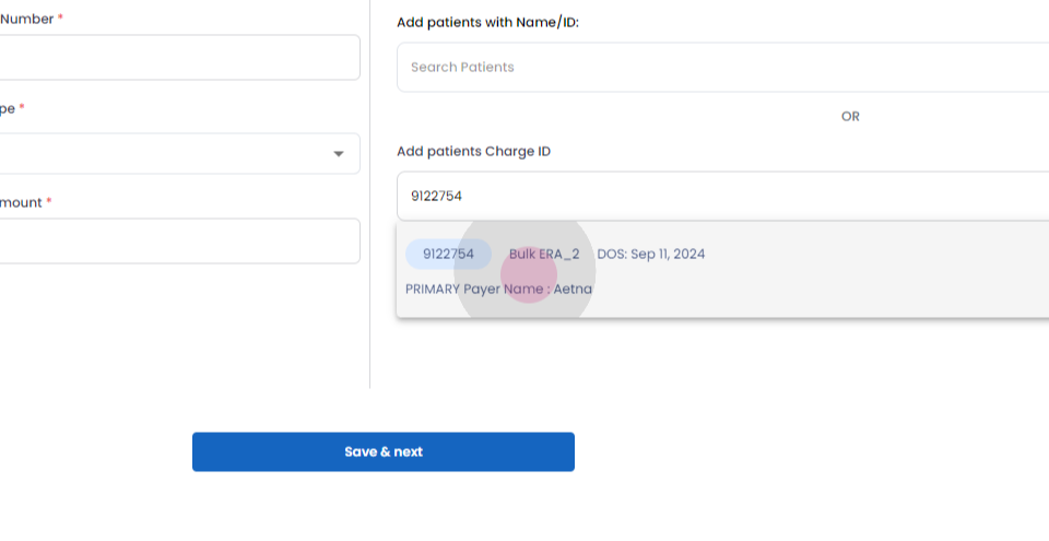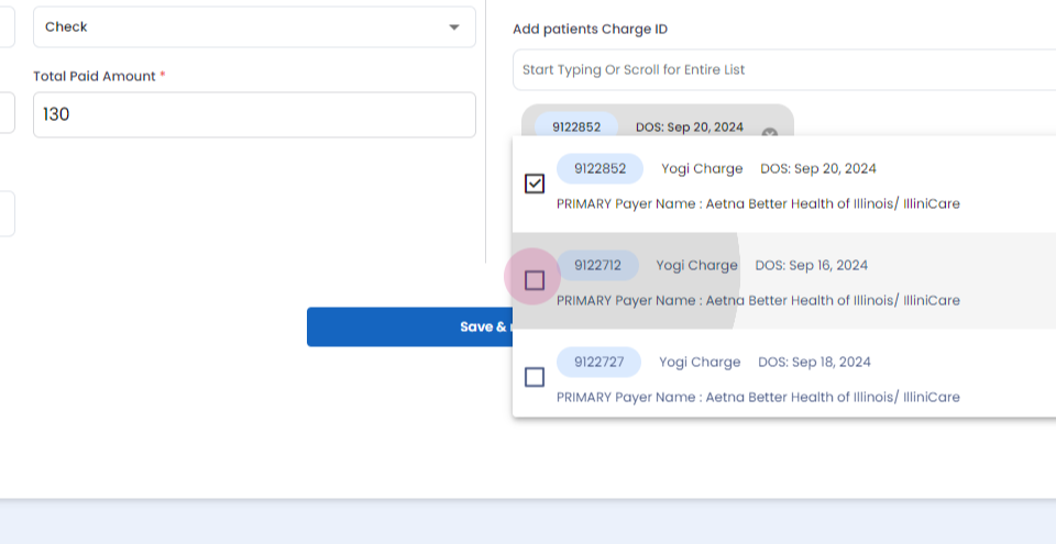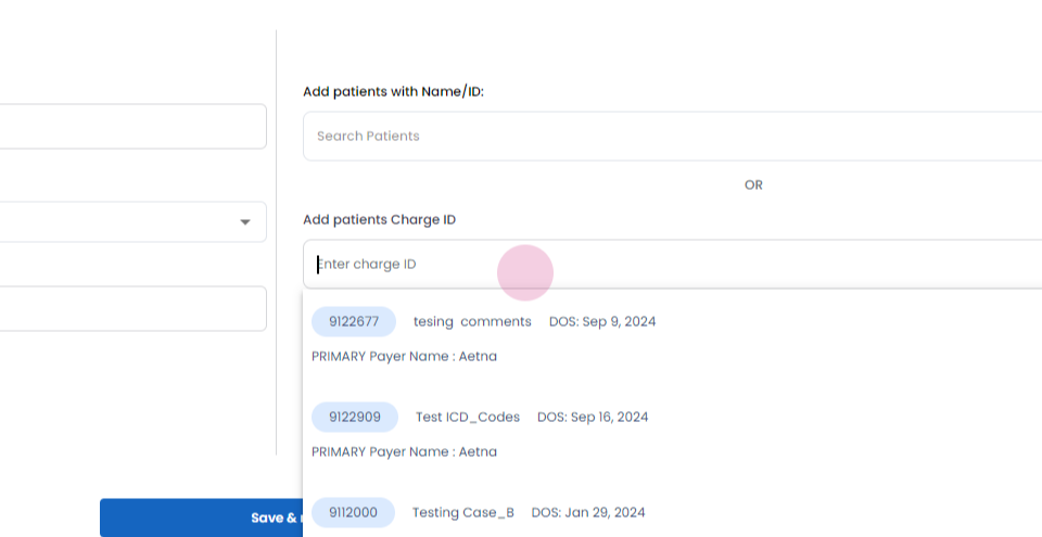 Step 6: Once a patient is selected, all the charge IDs of that patient will appear in a dropdown menu. Select multiple charge IDs as needed.