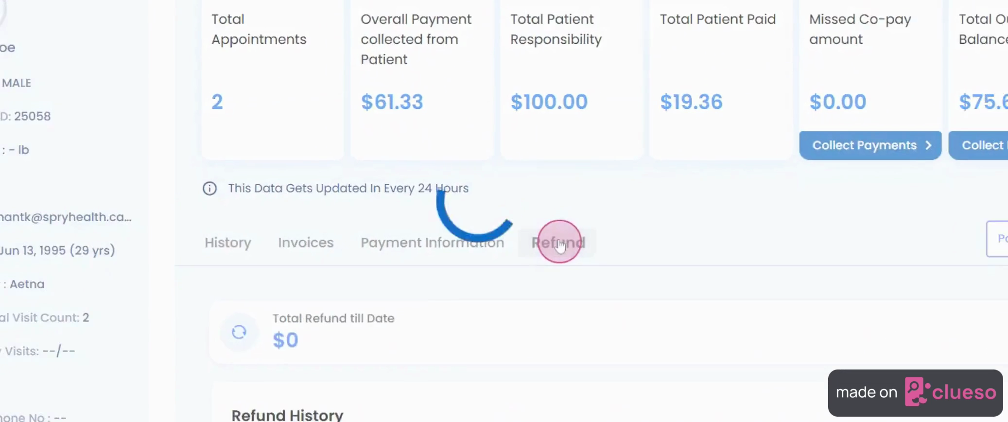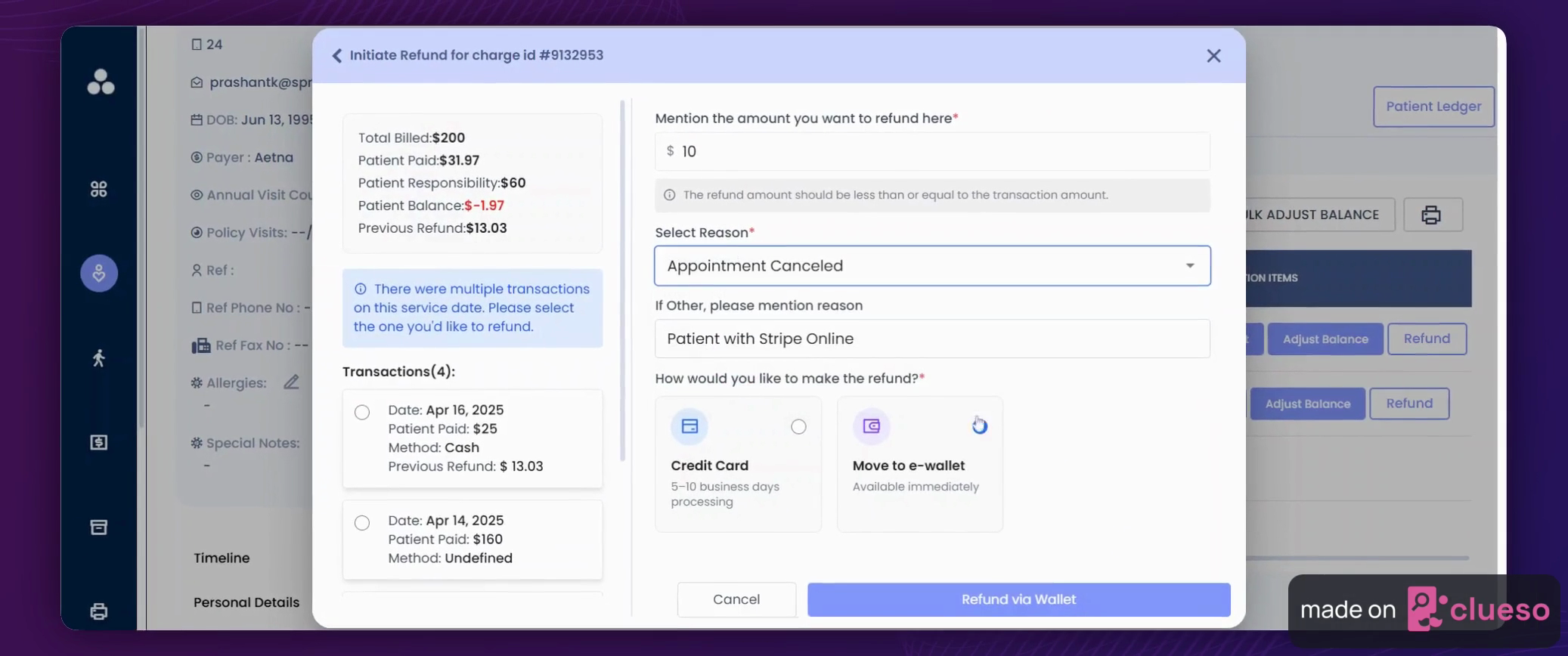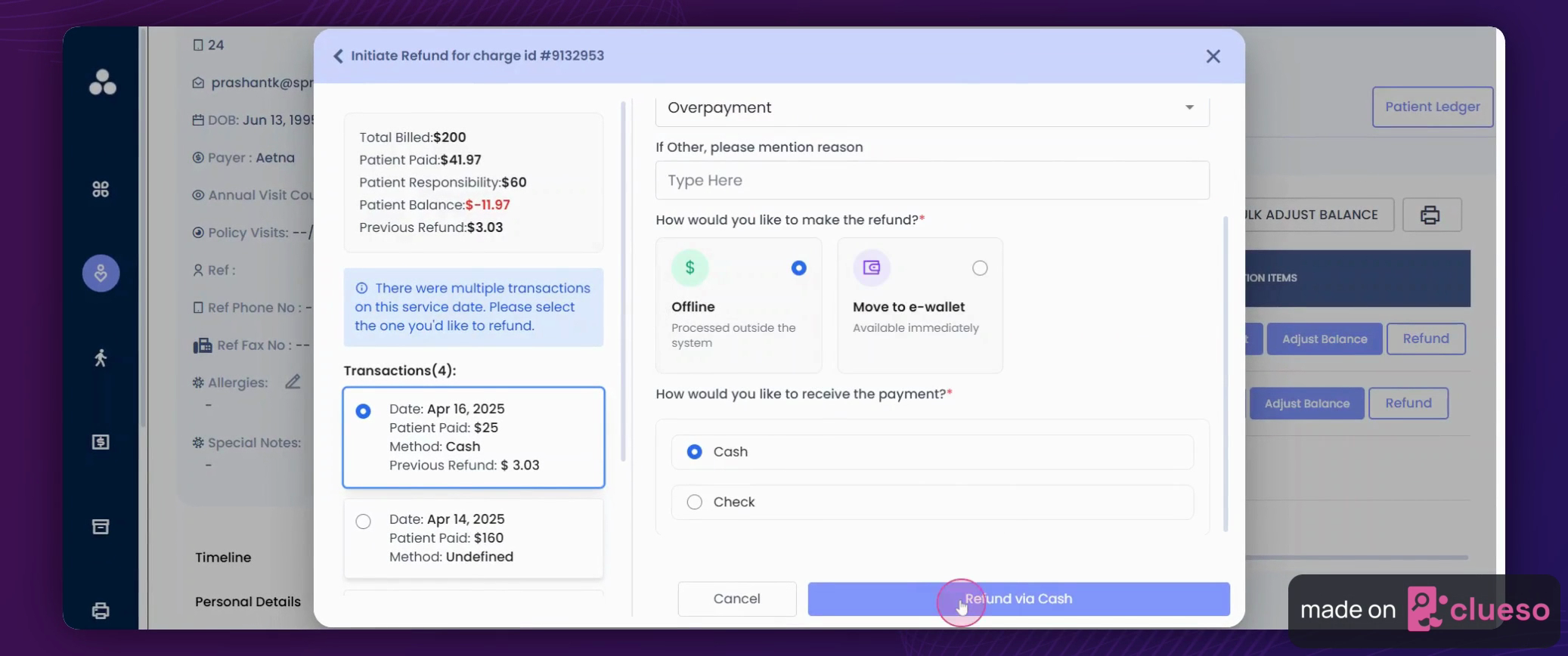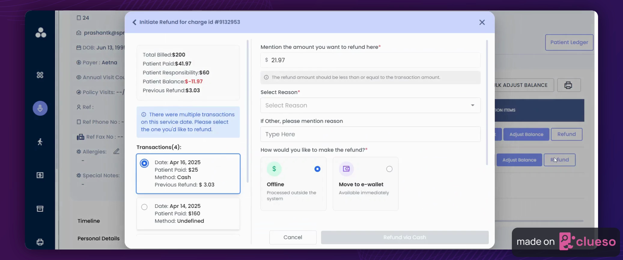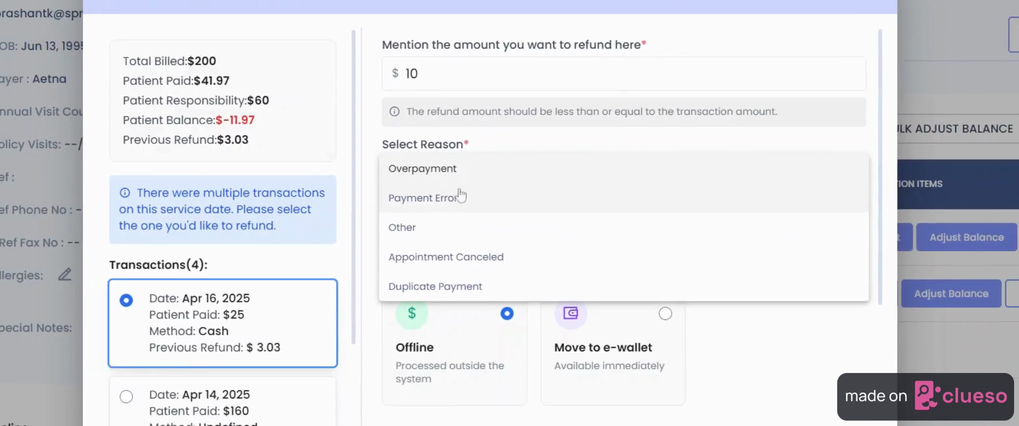 Step 4: Let's assume a transaction occurred on this charge ID on April 16th and the patient paid $25. Now, you need to refund an amount. Enter the amount you wish to refund.