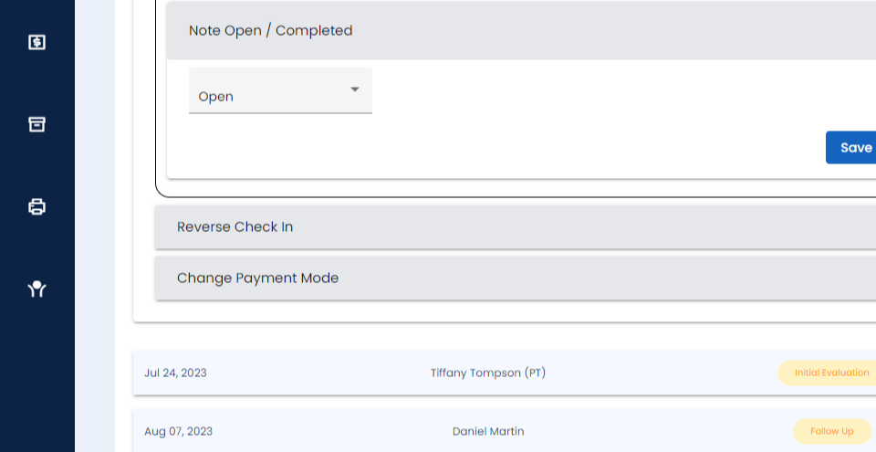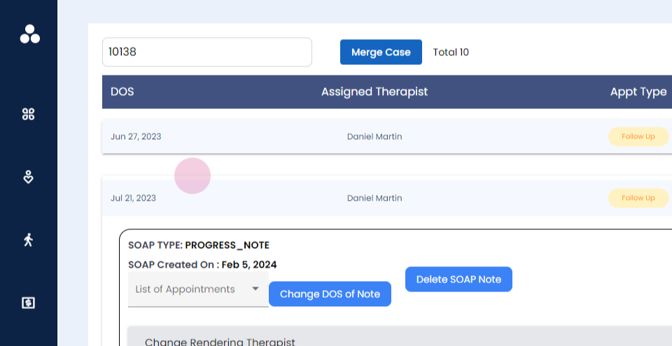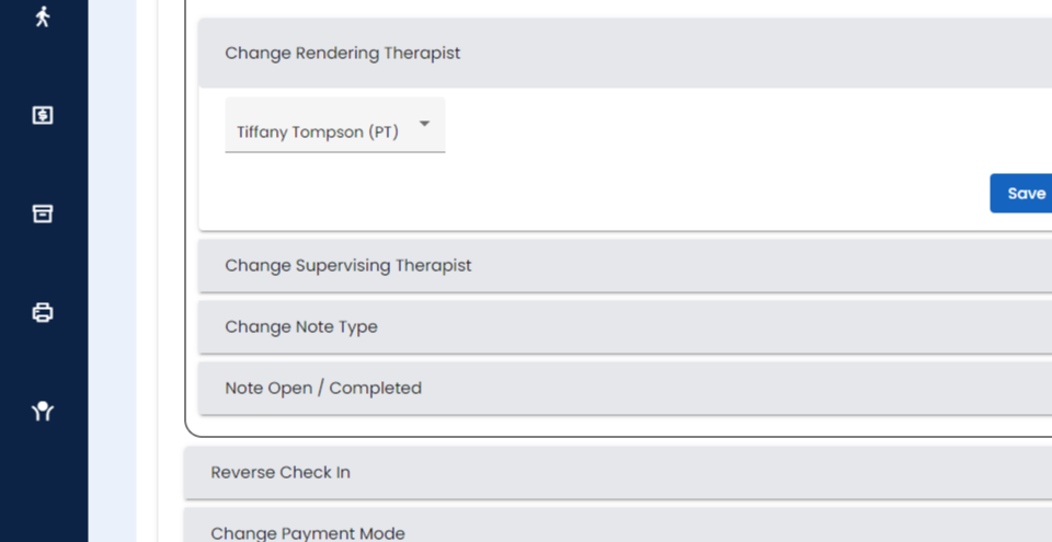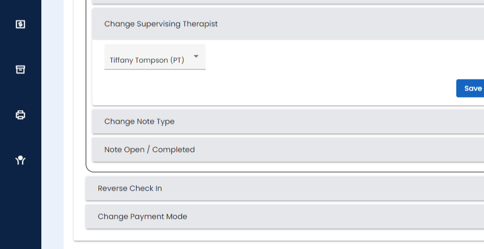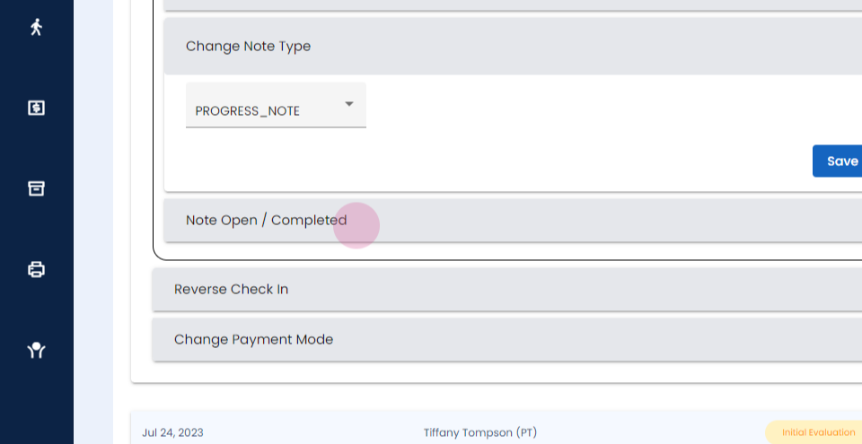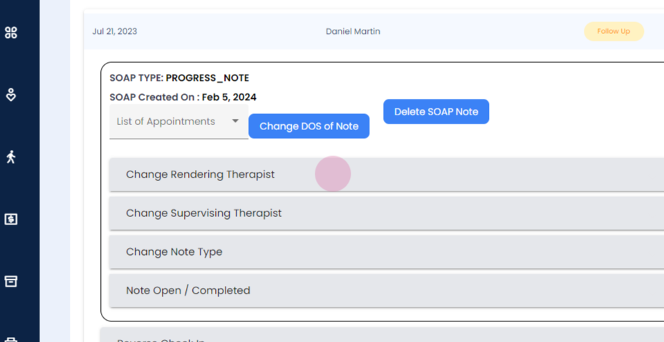 Step 4: You will be able to delete the soap note, change the rendering therapist, change supervising therapist, change the note type, close or open the note.