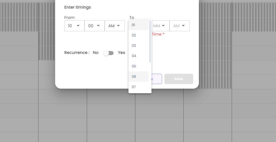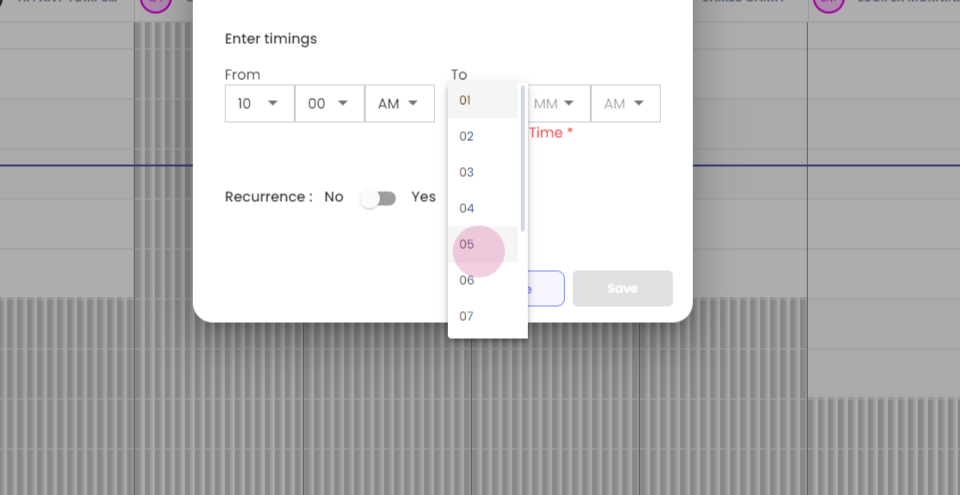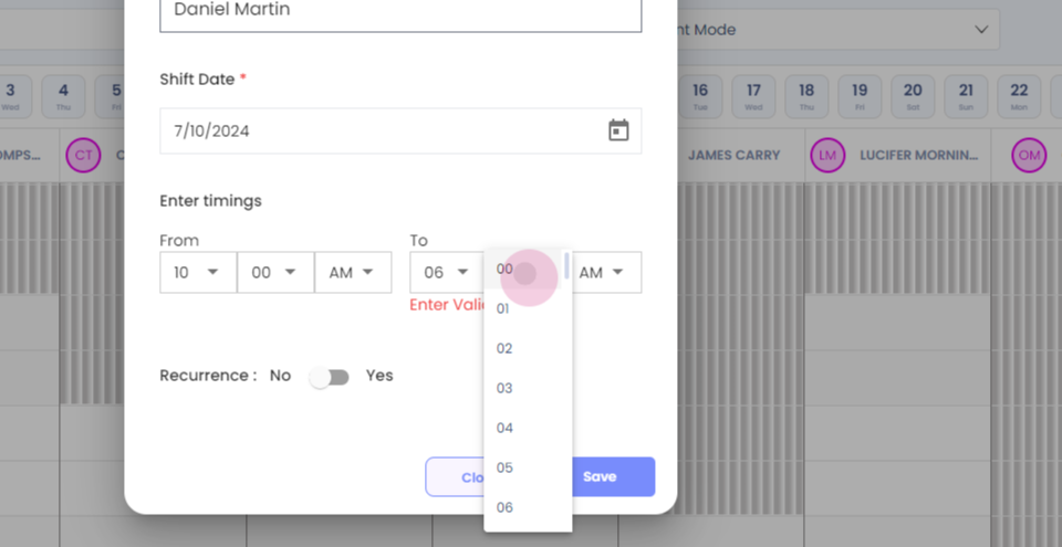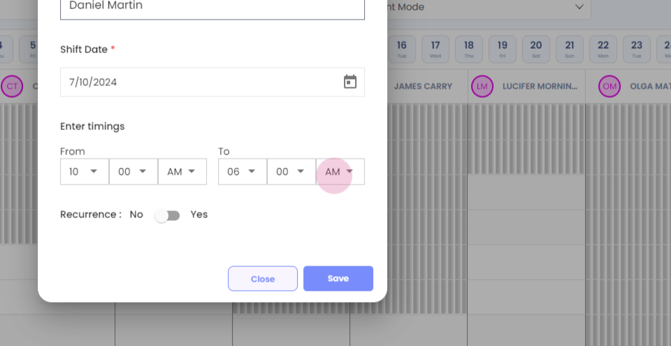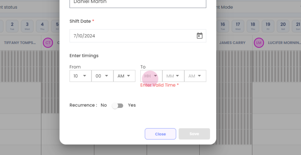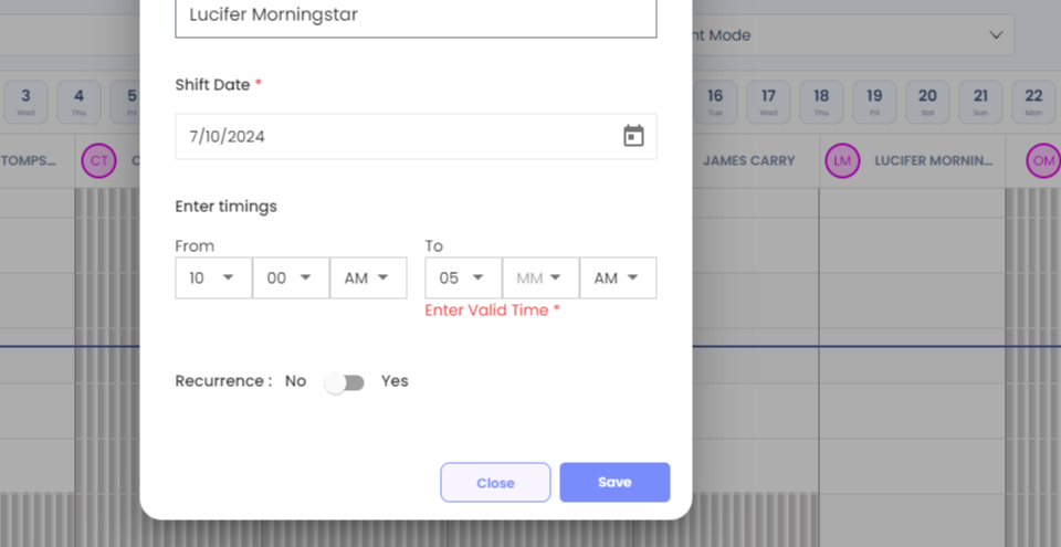 Step 6: Enter the end time of the shift, Click on save, and your shift will be updated successfully For making recurring shift time changes, select the time.